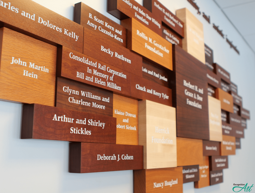 Our company has the experience to understand what motivates donors. Larry and Shelley have years of experience in donor relations and fundraising, having served on seven nonprofit boards where they assisted in capital campaigns ranging from $2.5 million to $160 million. We know how hard your job is; we’ve been there. We want to make this an easy and enjoyable collaboration, so RecognitionArt has incorporated that into the core of our business model. Honor and aesthetics play important roles when fundraising for a campaign and therefore play an important role in your donor wall design.